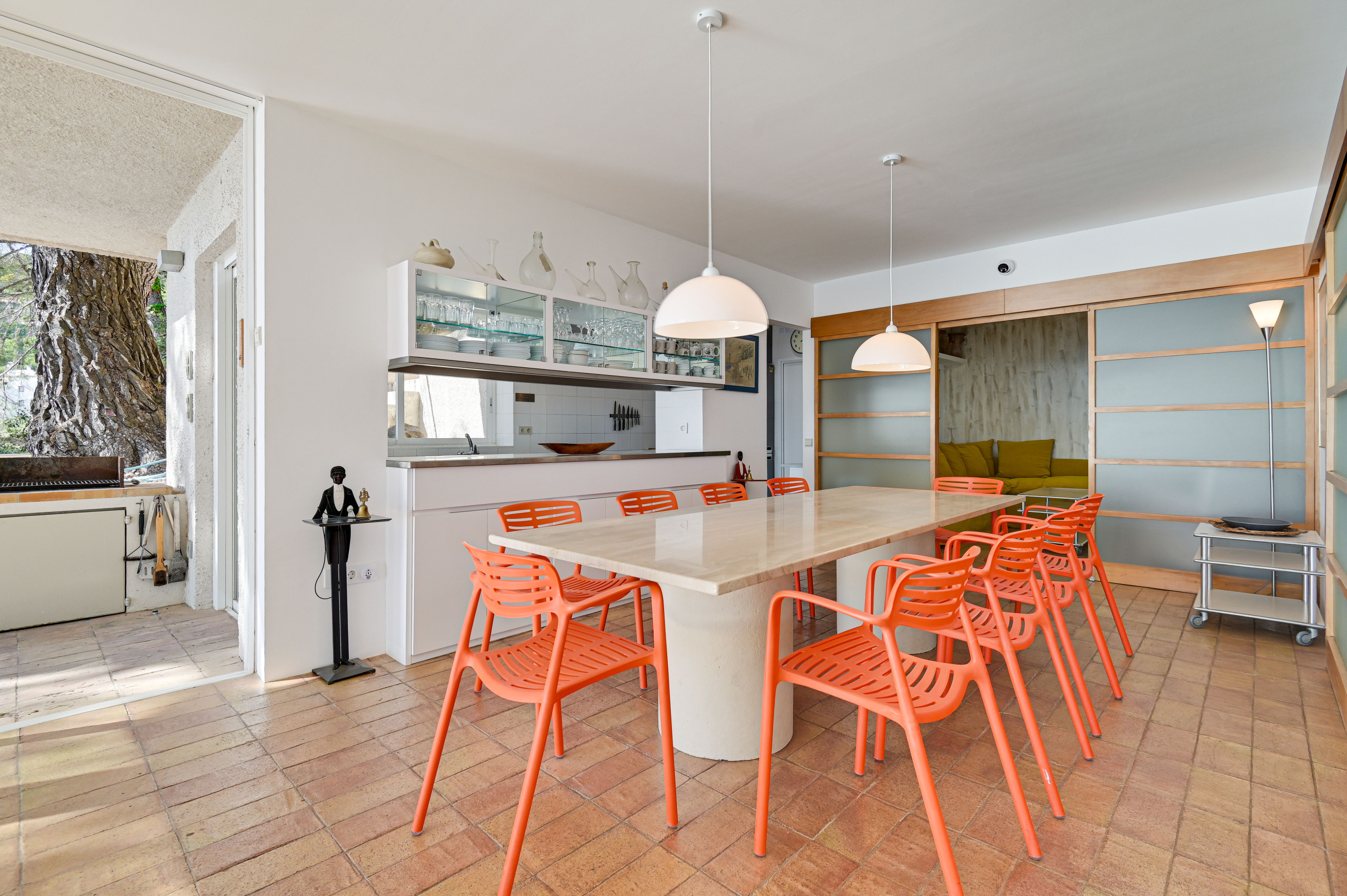 Directe toegang vanaf de eethoek en keuken tot het voorterras, met grote eettafel en barbecue, perfect voor diners in de buitenlucht tijdens de zomer