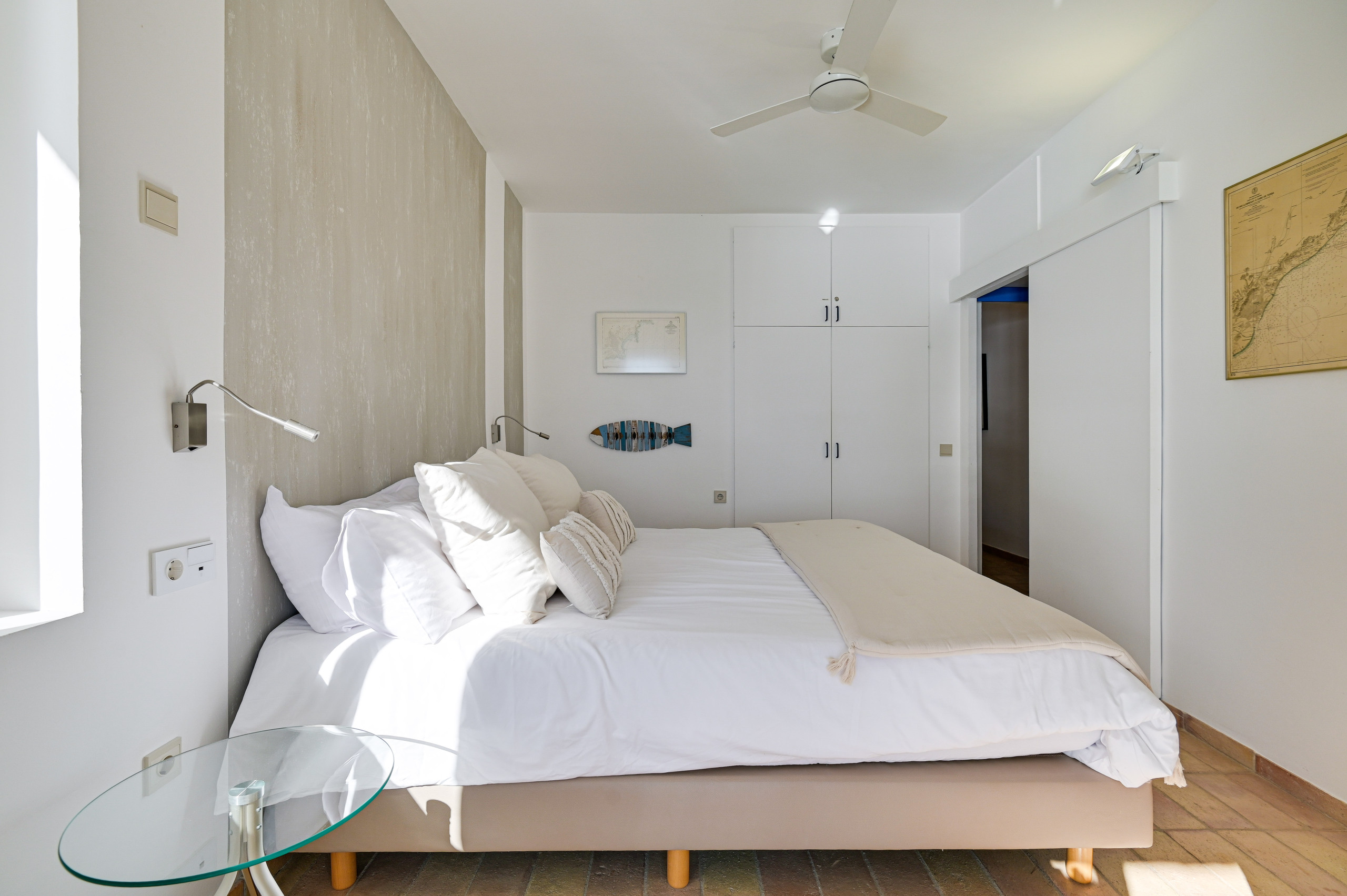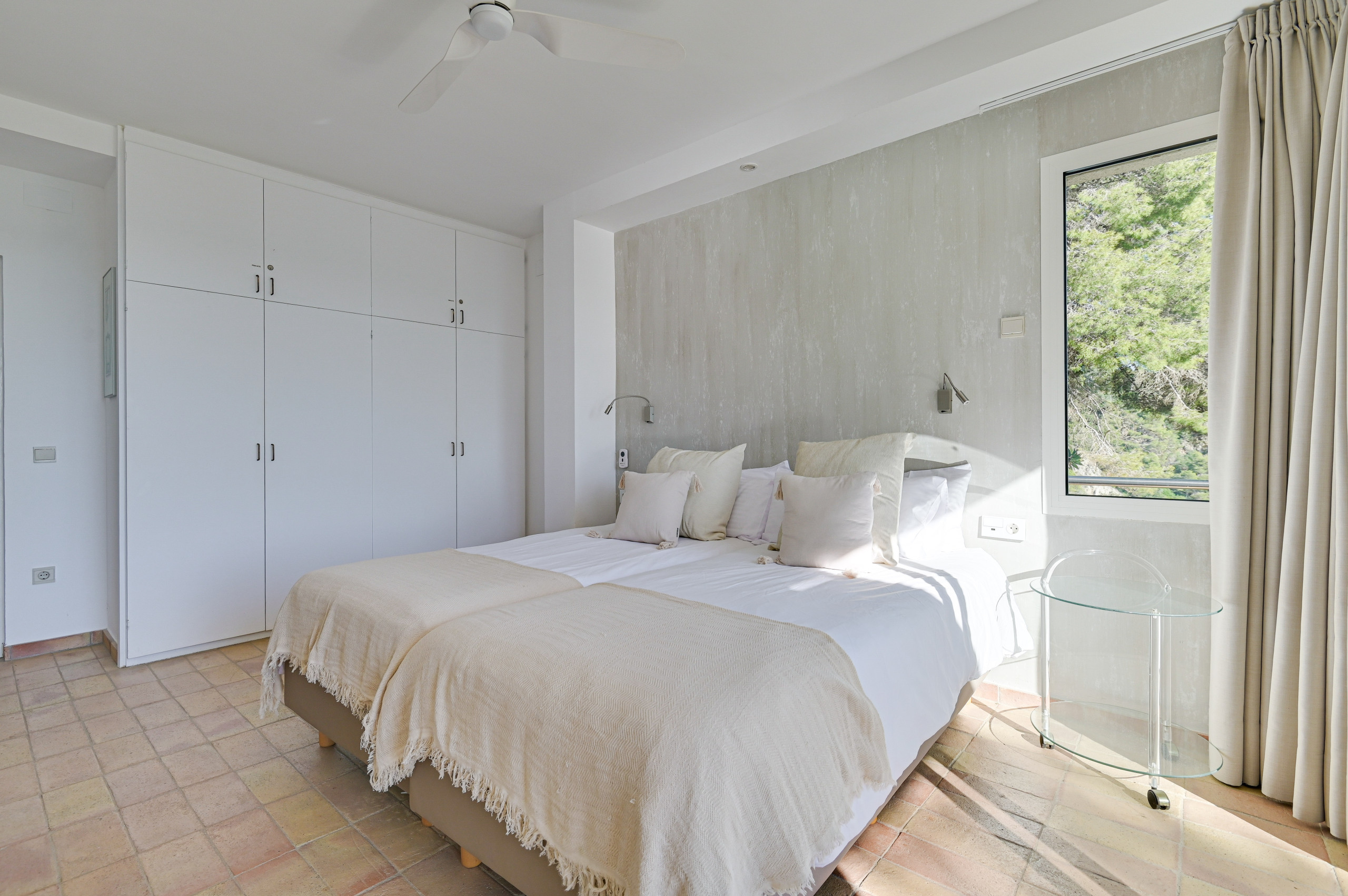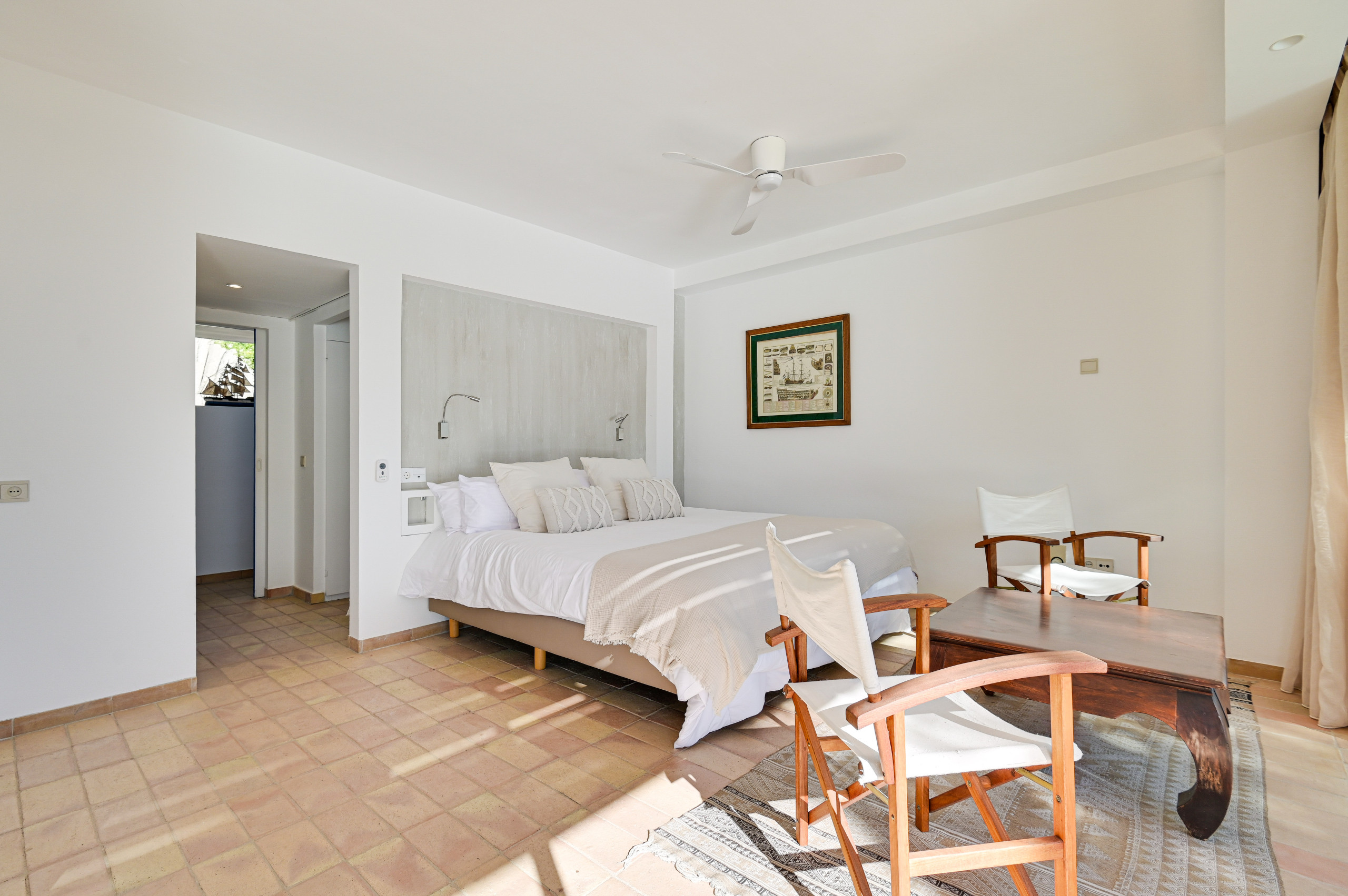 Alle tweepersoonsbedden zijn 180 cm breed en de eenpersoonsbedden 90 cm breed. Alle slaapkamers hebben plafondventilatoren, hoewel de constante zeebries de villa van nature koel houdt.
