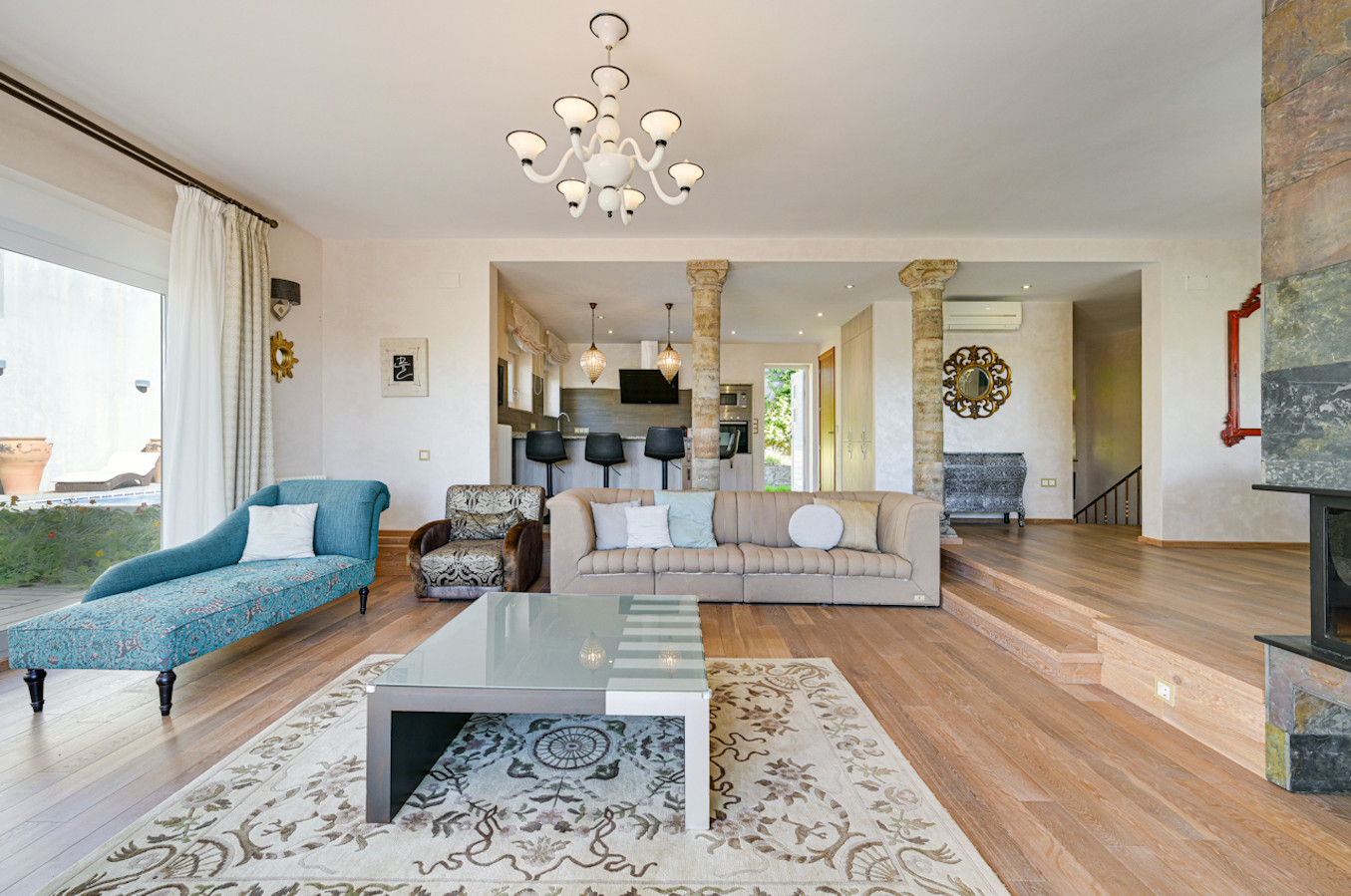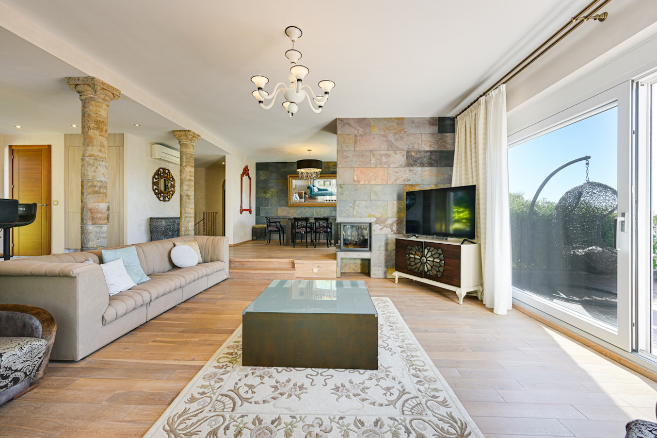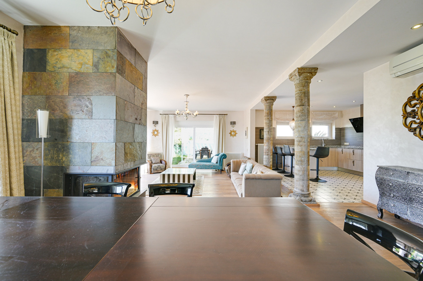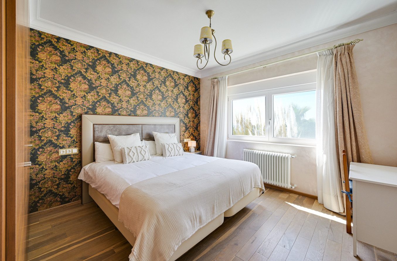 La villa ha sido decorada con mucho gusto, utilizando materiales de alta calidad, como suelos de madera y muebles de alta gama.