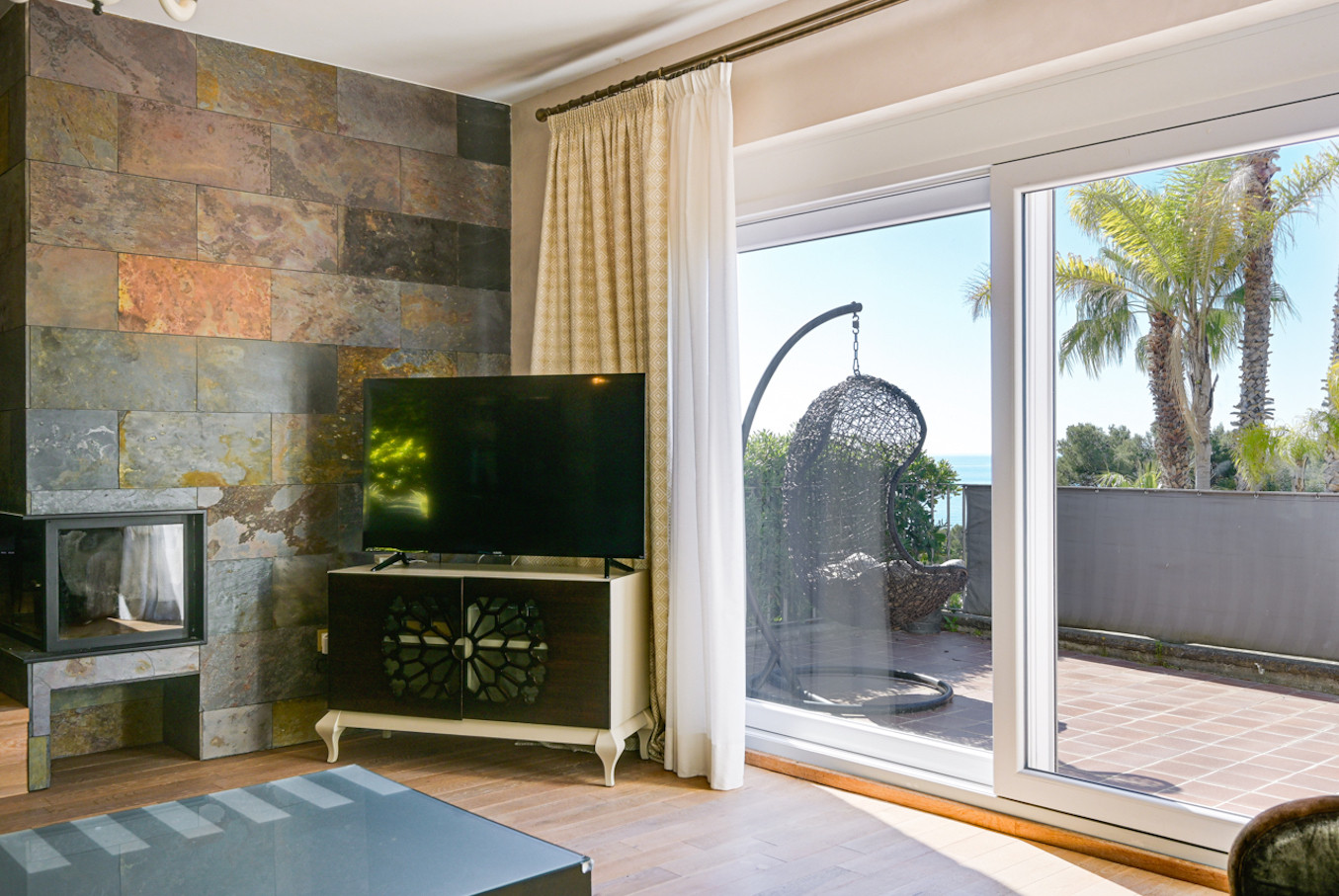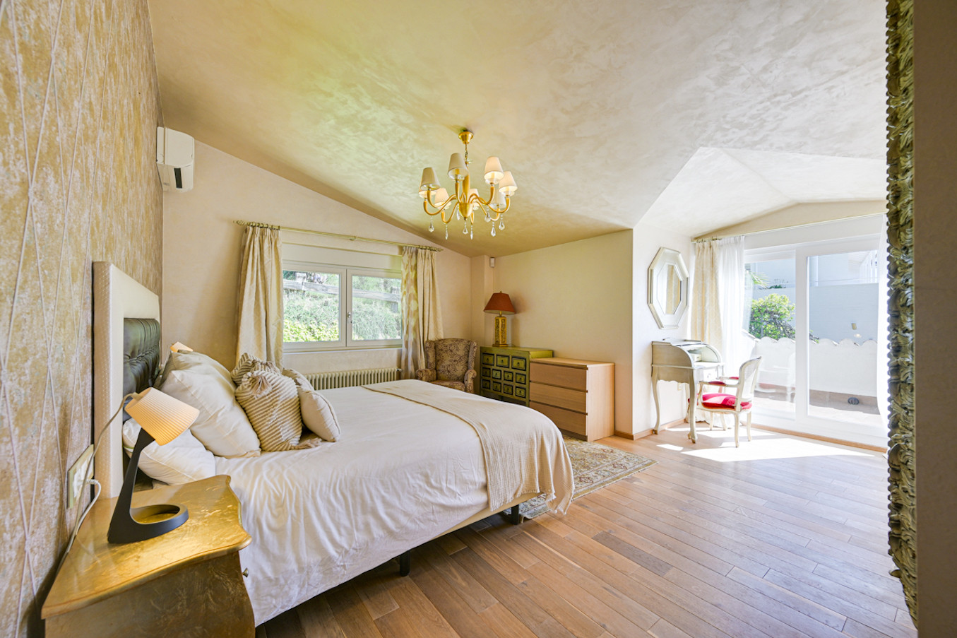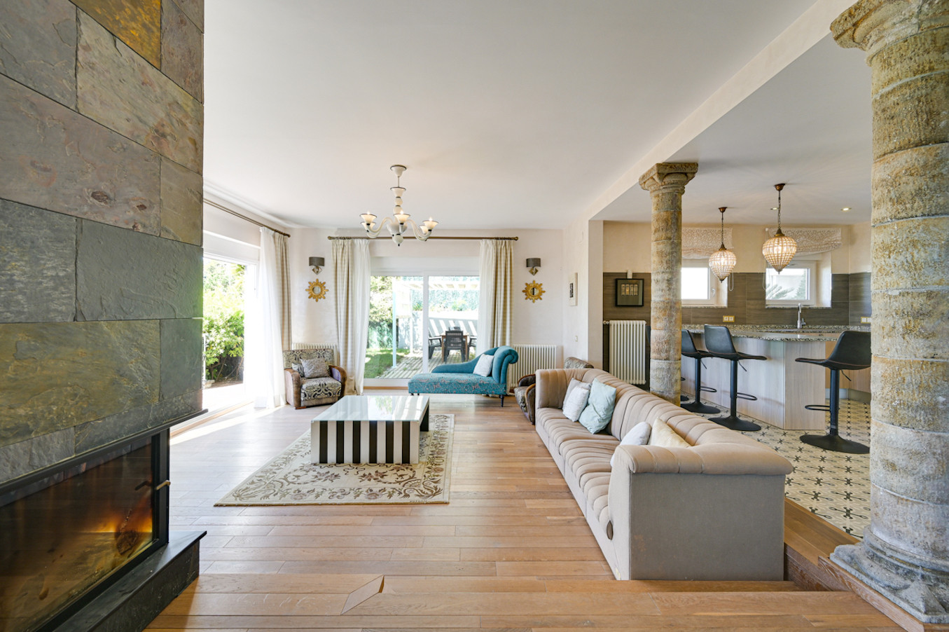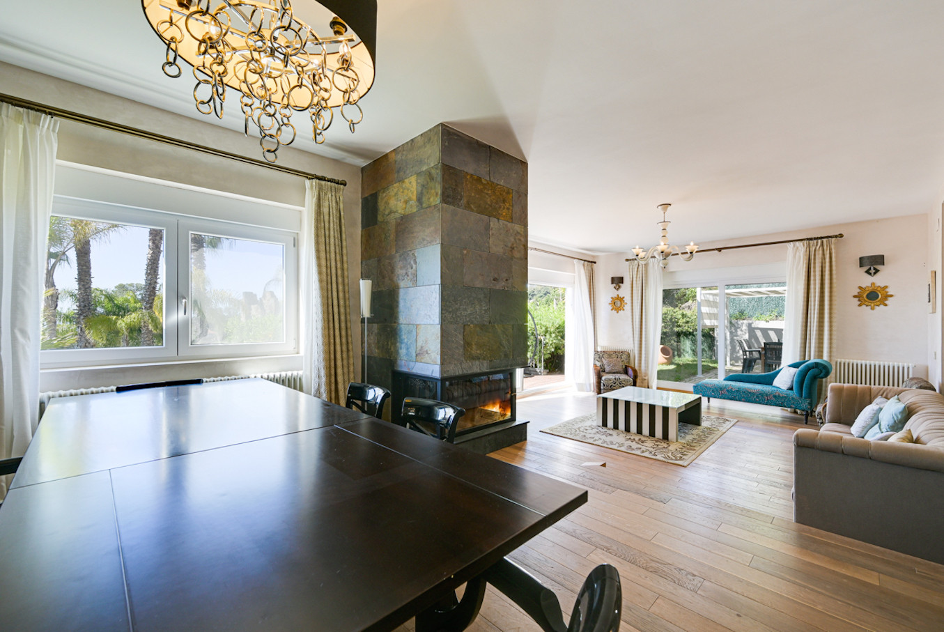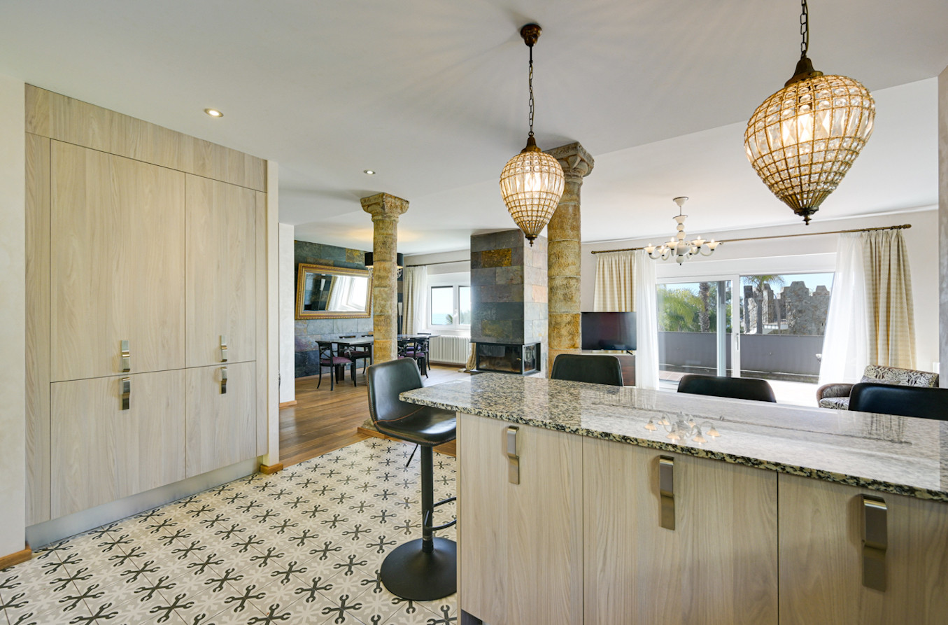 La villa ha sido decorada con mucho gusto, utilizando materiales de alta calidad, como suelos de madera y muebles de alta gama.