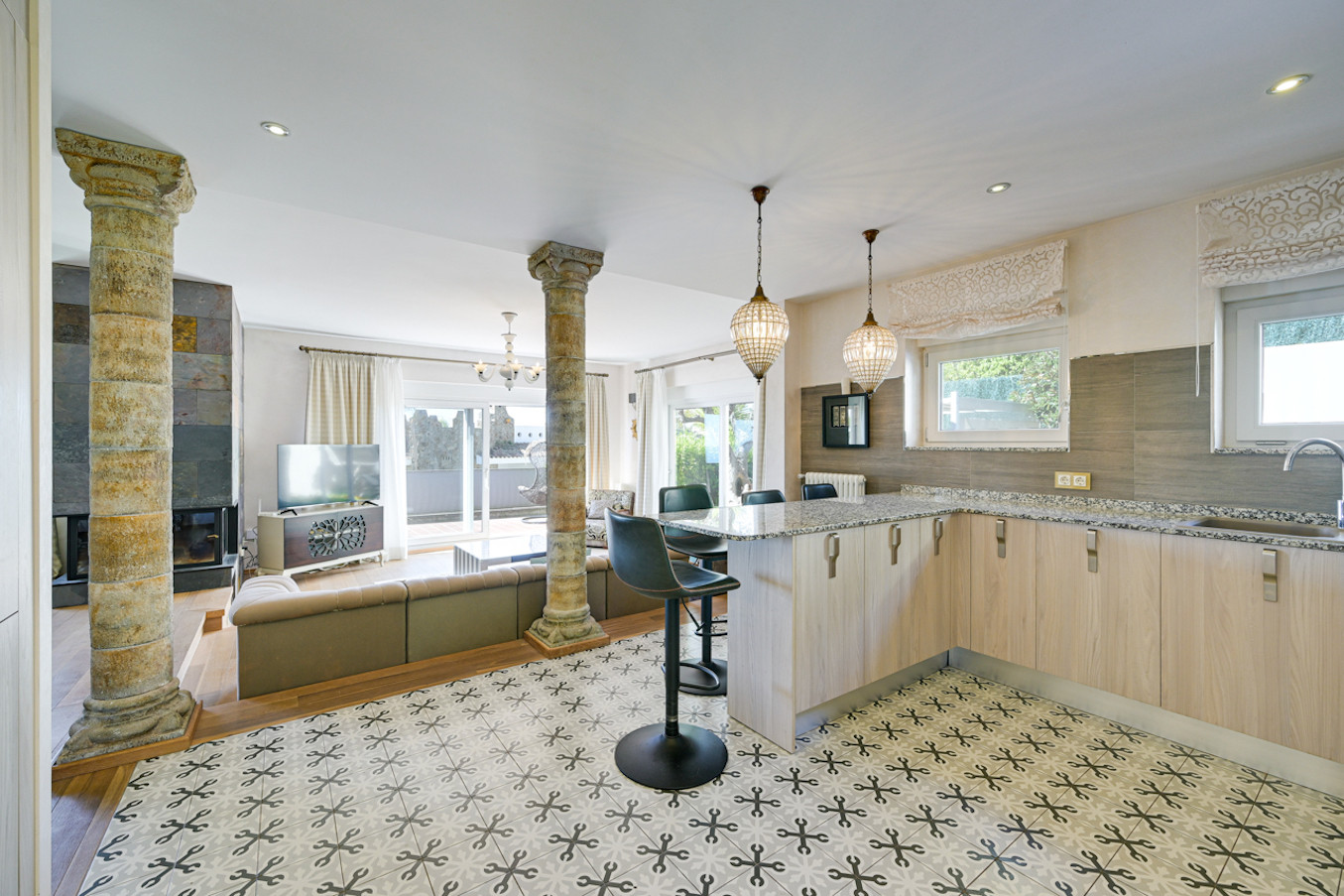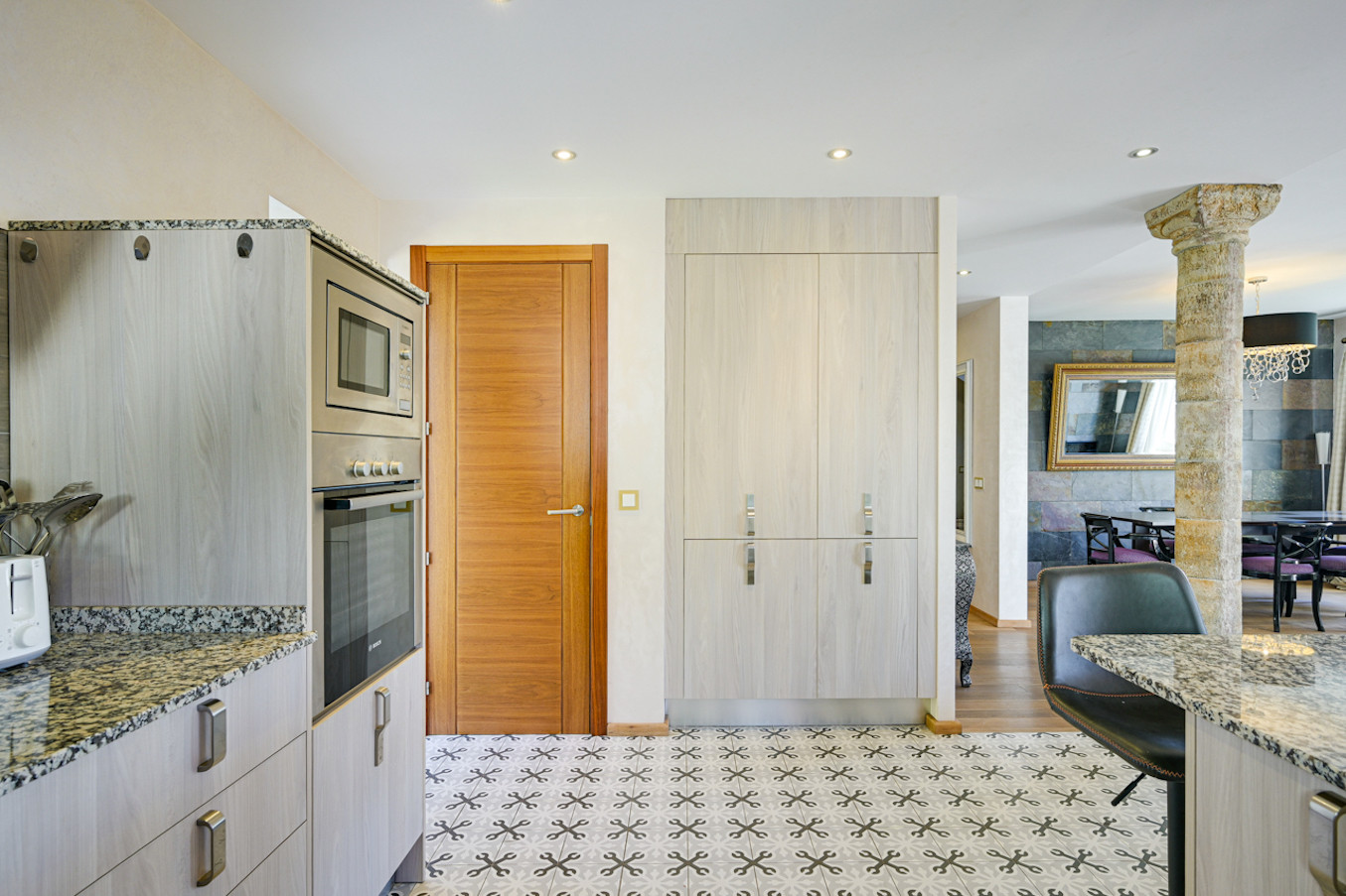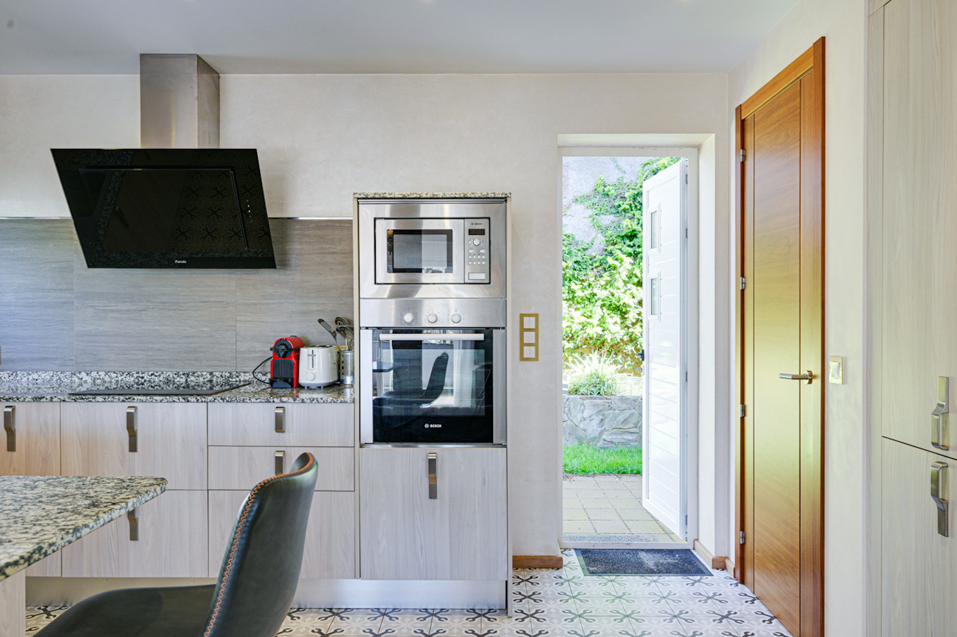 Desde el elegante vestíbulo, se accede al amplio salón-comedor diáfano. La cocina, totalmente equipada, tiene acceso directo al exterior. También dispone de lavadero independiente con lavadora y secadora.