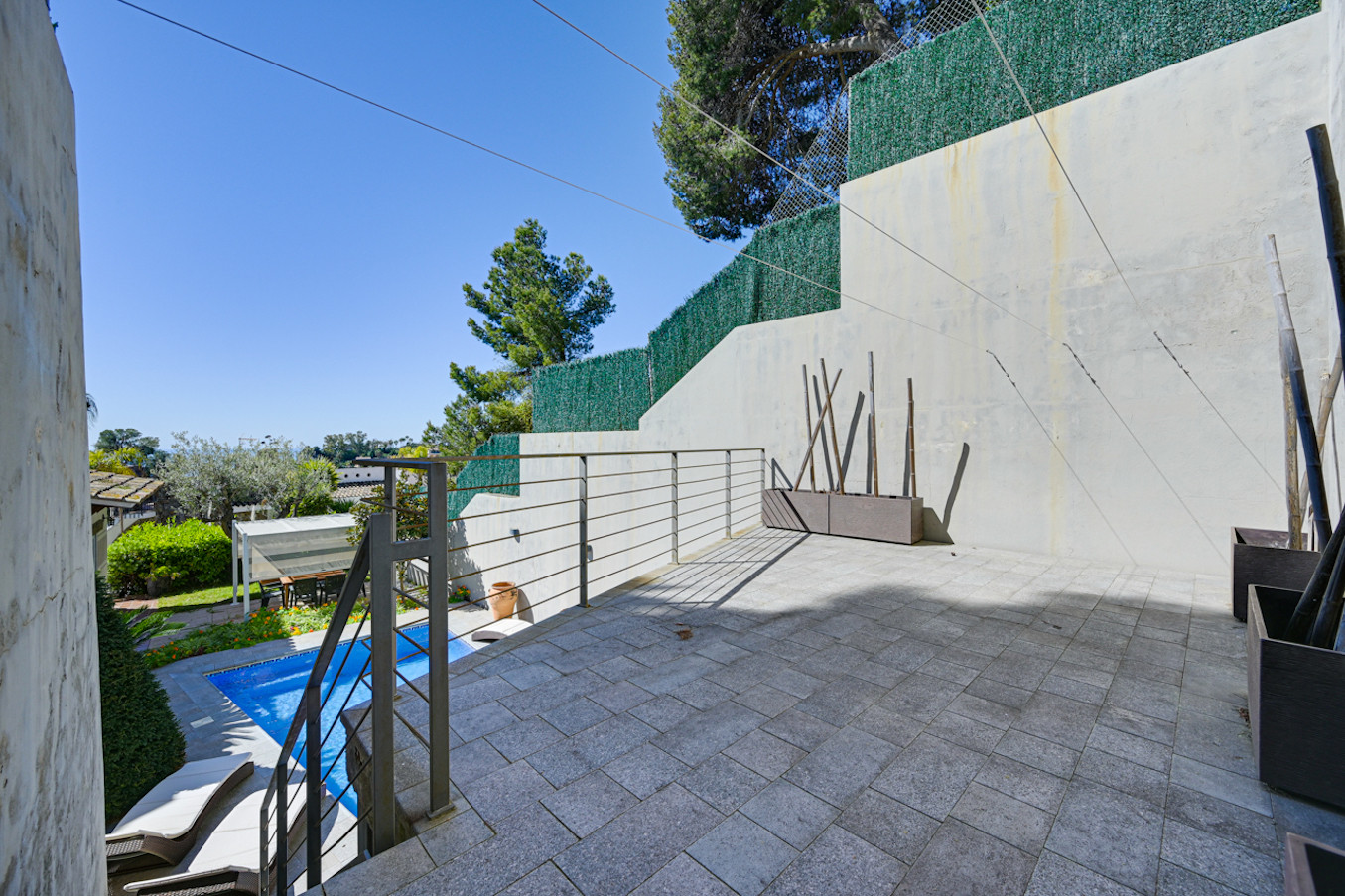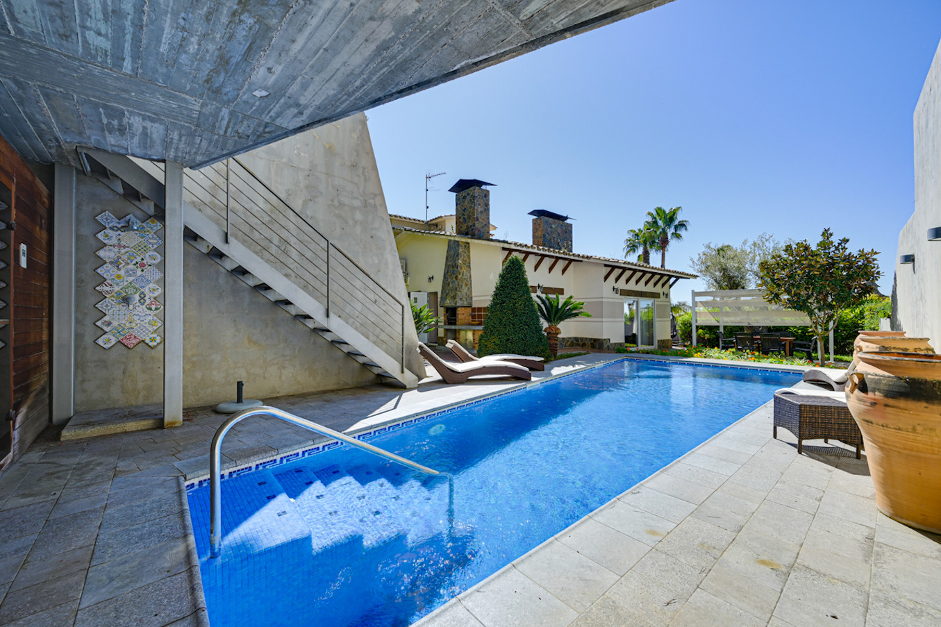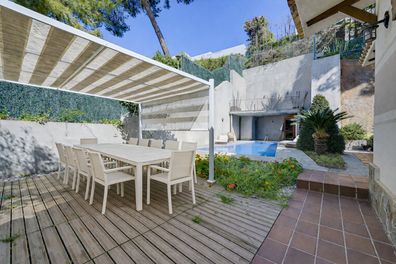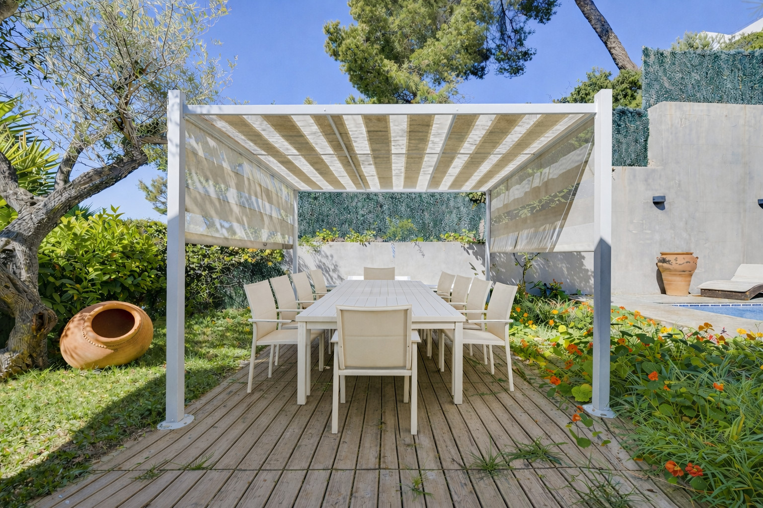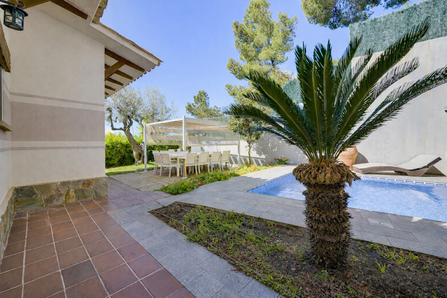 En el exterior encontrará la piscina privada con tumbonas y sombrilla. Además, hay un comedor exterior independiente con pérgola y una gran mesa.
