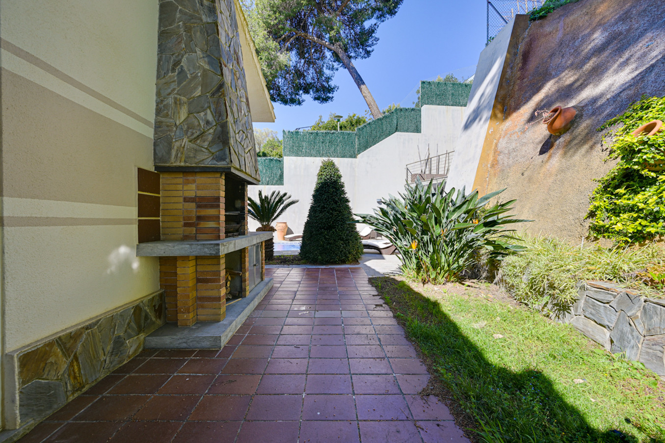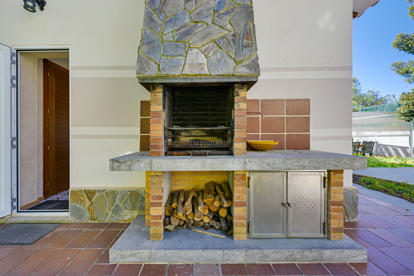 Barbacoa de piedra integrada, ideal para comer al aire libre.