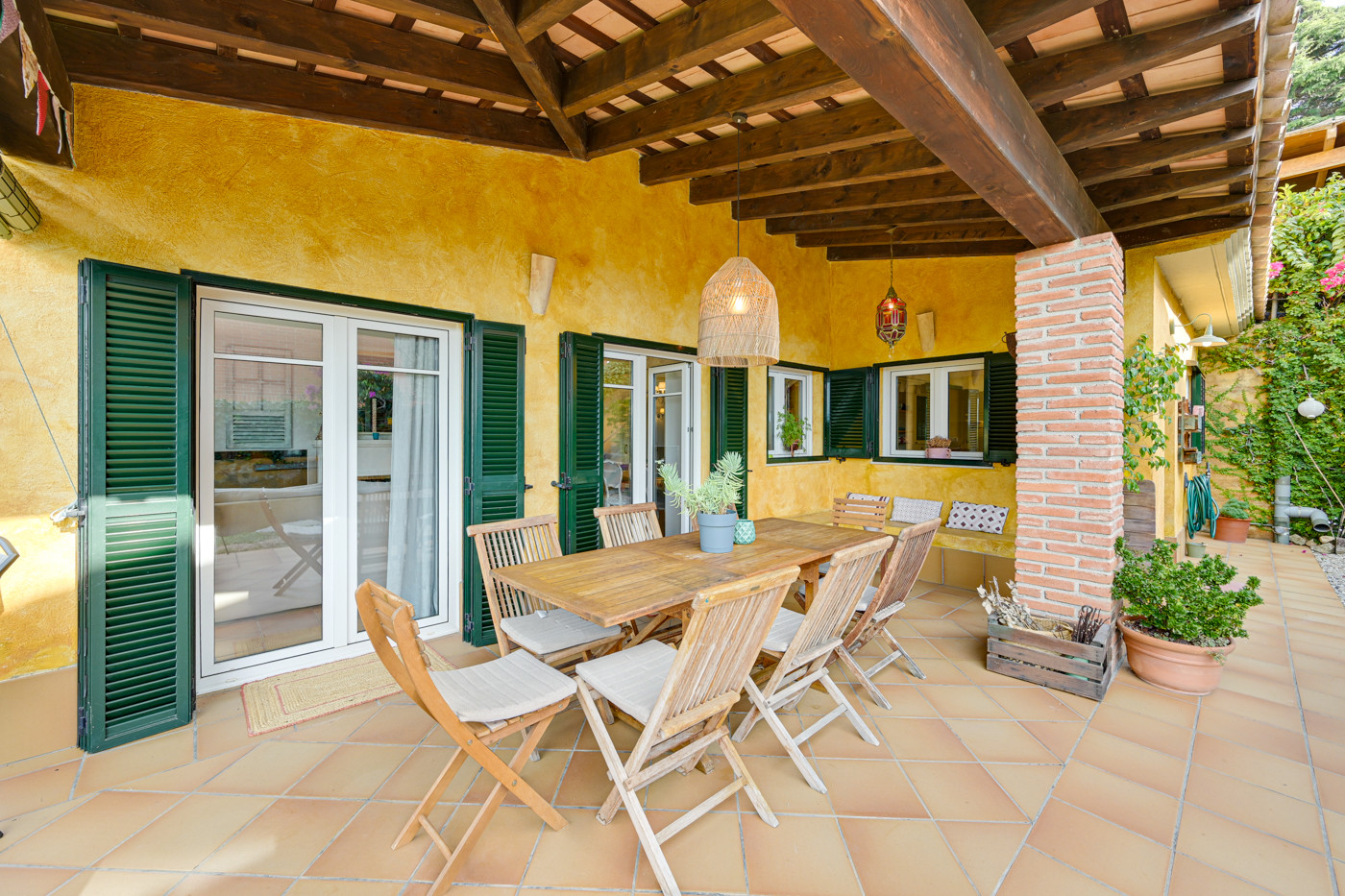 En la planta baja se encuentran el salón con TV, chimenea y zona comedor. Cocina totalmente equipada con rincón para comer. Desde el salón/comedor y la cocina tiene acceso directo a la terraza con mesa de comer exterior bajo un porche, para poder disfrutar de la cena durante las cálidas noches de verano. Barbacoa de carbón Weber.