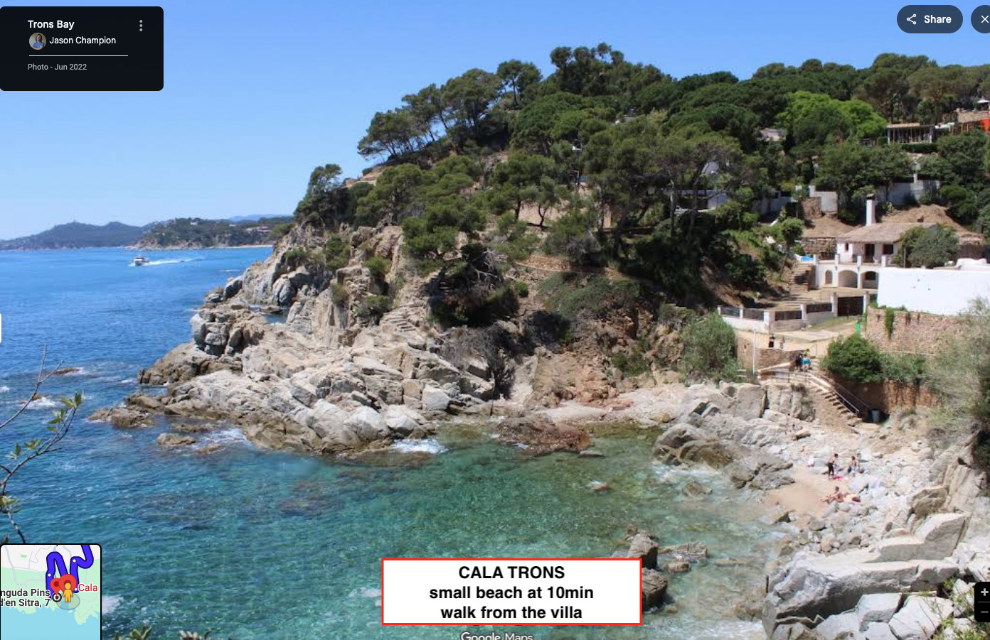 La idílica playa de Cala Trons se encuentra a solo 400 metros de la villa, a 5 minutos a pie. Se trata de una pequeña playa de unos 100 m escondida entre rocas y pinos. Un pequeño y hermoso oasis con agua cristalina. En verano, ¡llegue temprano para asegurarse un lugar!