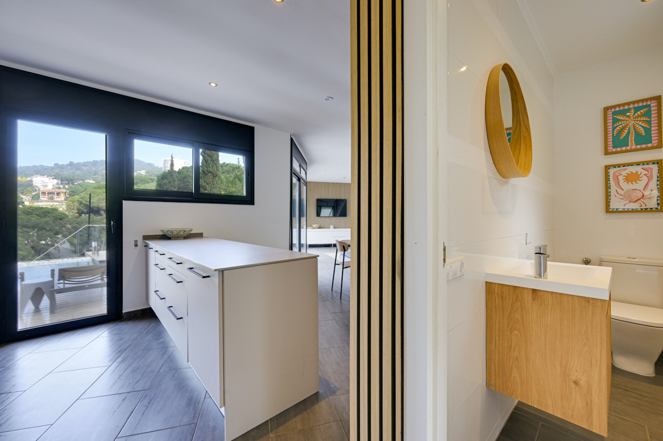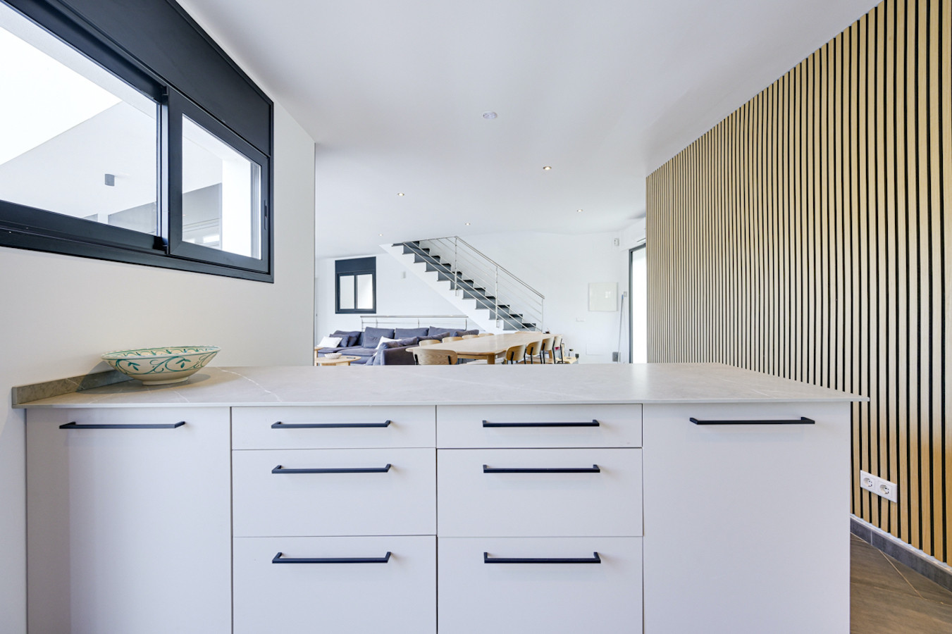 En el interior, la villa ofrece una cocina abierta totalmente equipada, una sala de estar amplia y luminosa con Smart TV, un gran sofá y una mesa de comedor, además de un aseo independiente para invitados. Desde la sala de estar se tiene acceso directo a la terraza y a la zona de la piscina.
