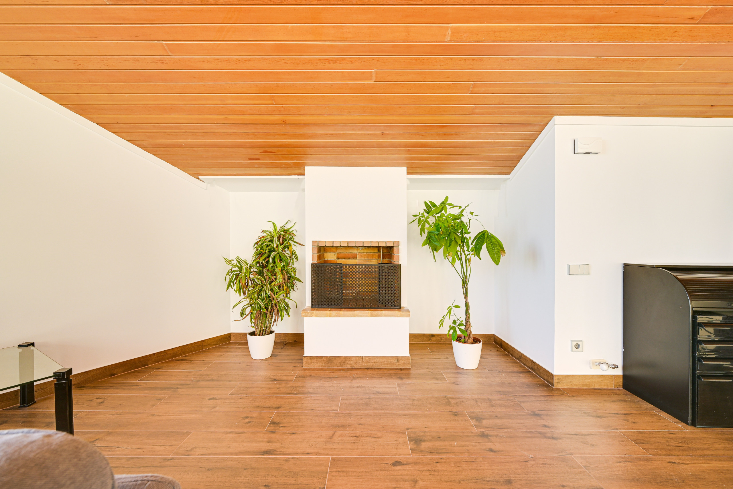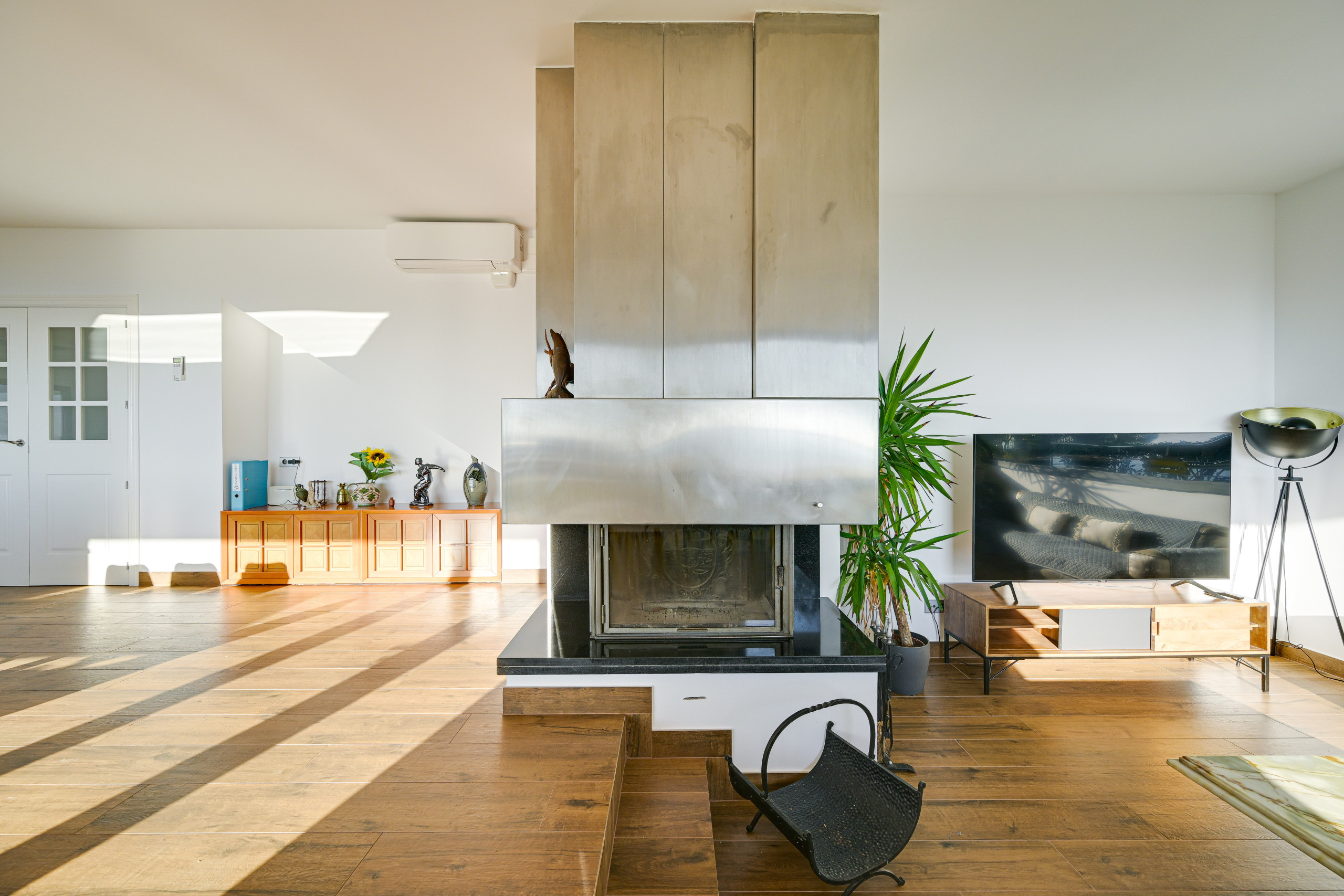 El salón dispone de Smart TV, chimenea, zona de comedor interior y acceso directo a la terraza, el jardín y la piscina, creando un espacio perfecto para disfrutar tanto del interior como del exterior.
