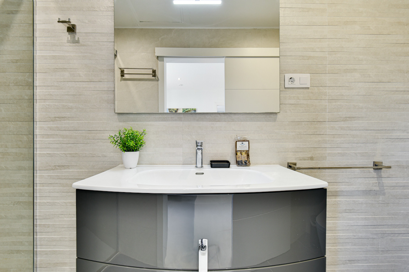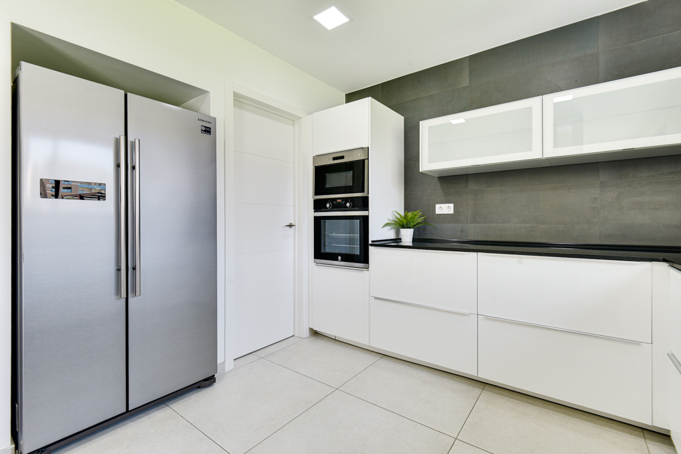 En la planta baja se encuentra un luminoso salón con un gran sofá y zona de comedor, equipado con TV y cuenta de Netflix incluida. Cocina americana totalmente equipada, con nevera americana y acceso directo a la terraza y zona de piscina. En esta planta también se dispone de un baño completo con ducha y un lavadero independiente con lavadora y secadora.