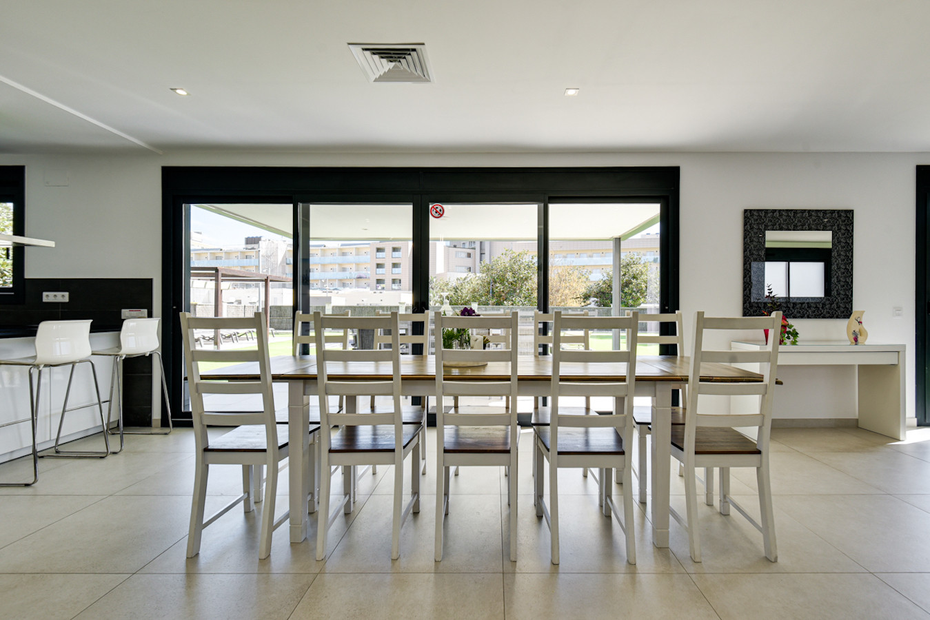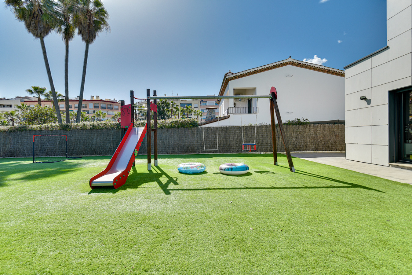 La villa cuenta con una magnífica terraza cubierta con una gran mesa de comedor exterior para hasta 10 personas. El amplio jardín dispone de piscina privada (3 x 8 m), zona infantil con parque de juegos y porterías de fútbol, pérgola, 10 tumbonas y barbacoa de piedra. Un espacio exterior pensado para disfrutar largas jornadas al aire libre, especialmente diseñado para vacaciones en familia.