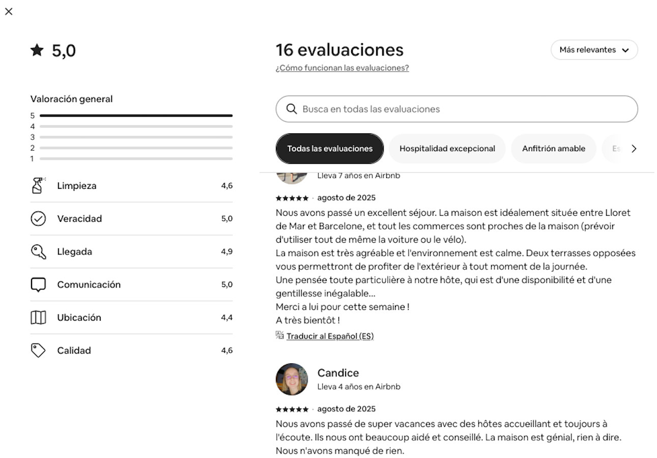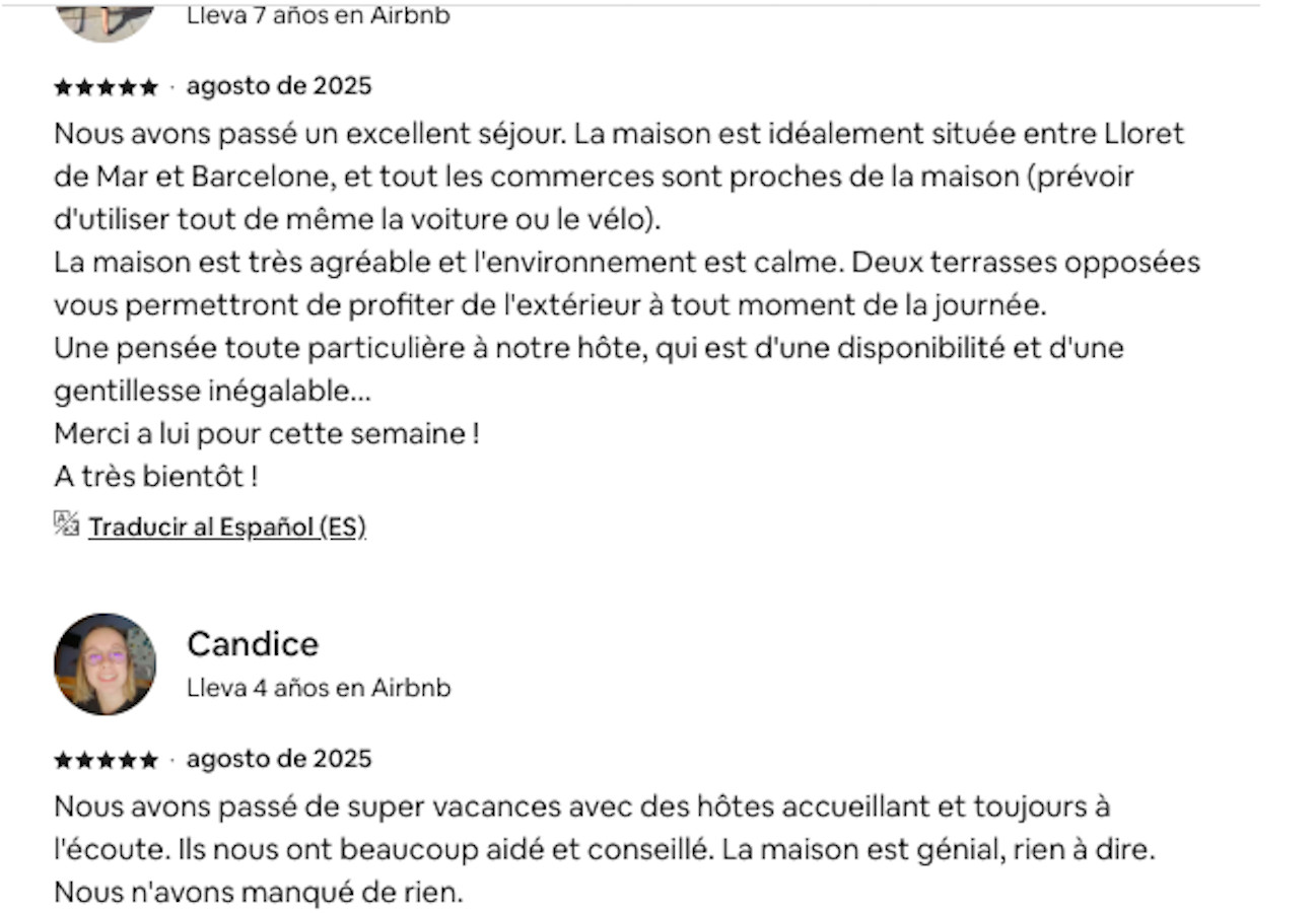 Nous avons passé un excellent séjour . La maison est idéalement située entre Lloret et Barcelone, et tout les commerces sont proches de la maison (prévoir d'utiliser tout de même la voiture ou le vélo).