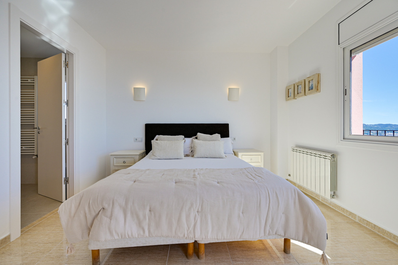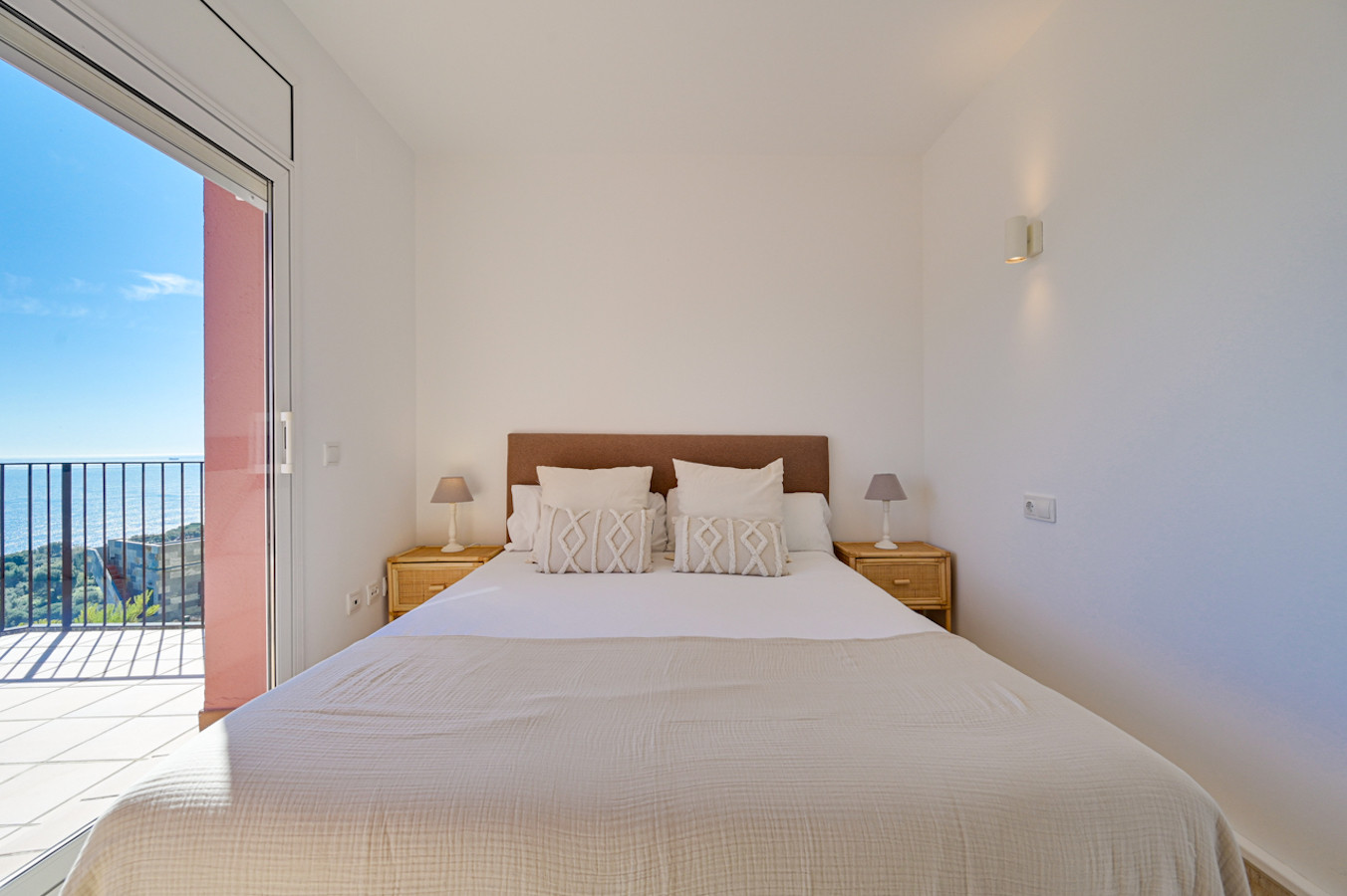 - Master bedroom (double bed) with an en-suite bathroom with shower, and a balcony with stunning sea views.