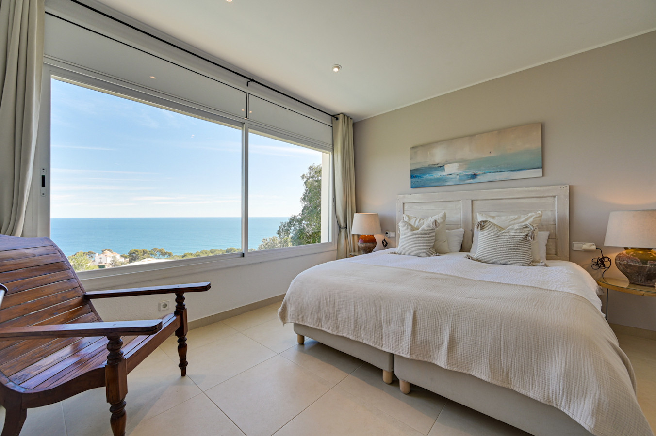 One level down is the master bedroom with en-suite bathroom (with shower), offering direct sea views from the bed.