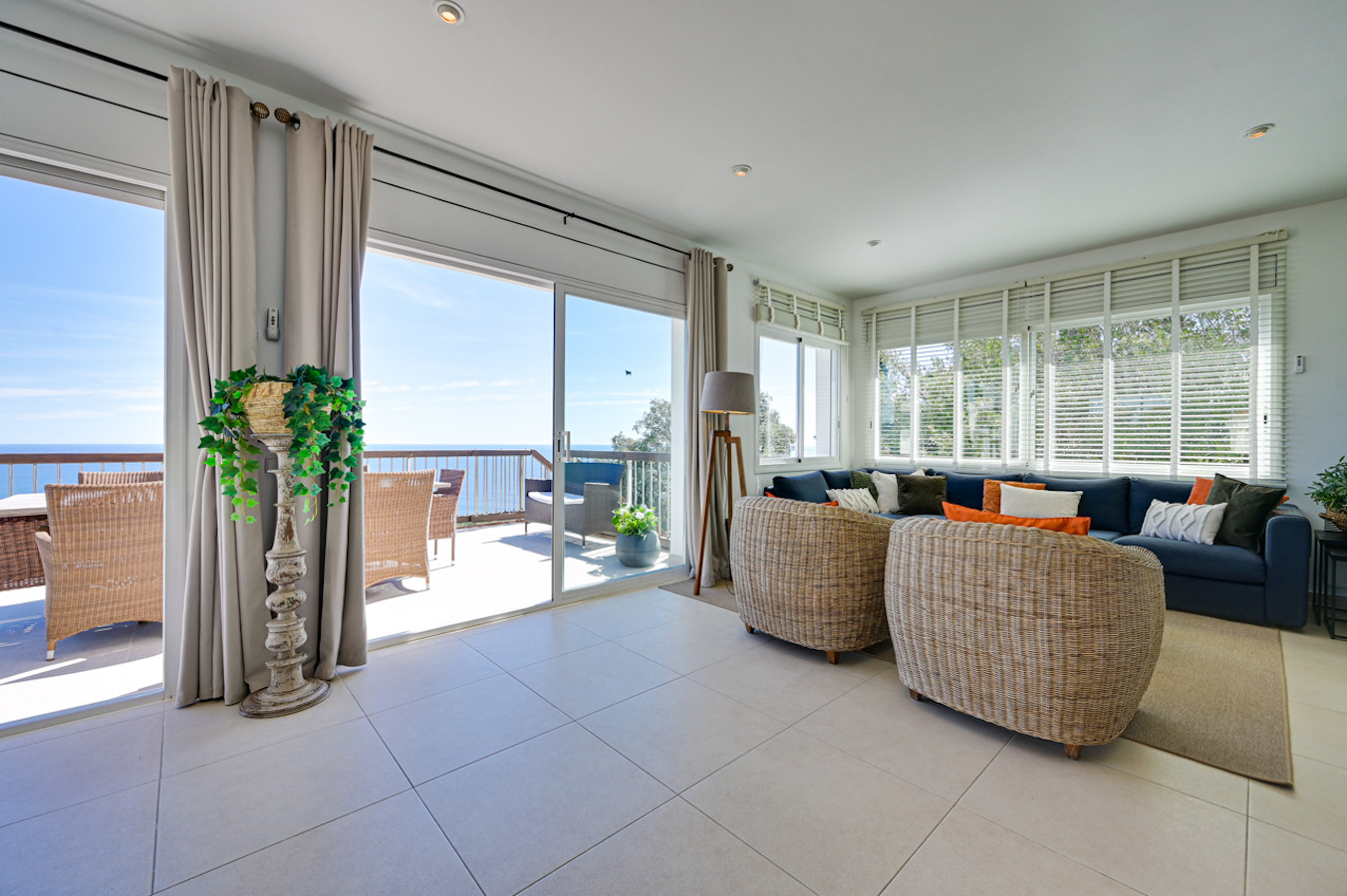 The villa is accessed via the upper floor, which features a bright living room with Smart TV and dining area. Through sliding doors, you reach the spacious balcony with an outdoor dining table, BBQ and automatic awning — ideal for al fresco meals with sea views.