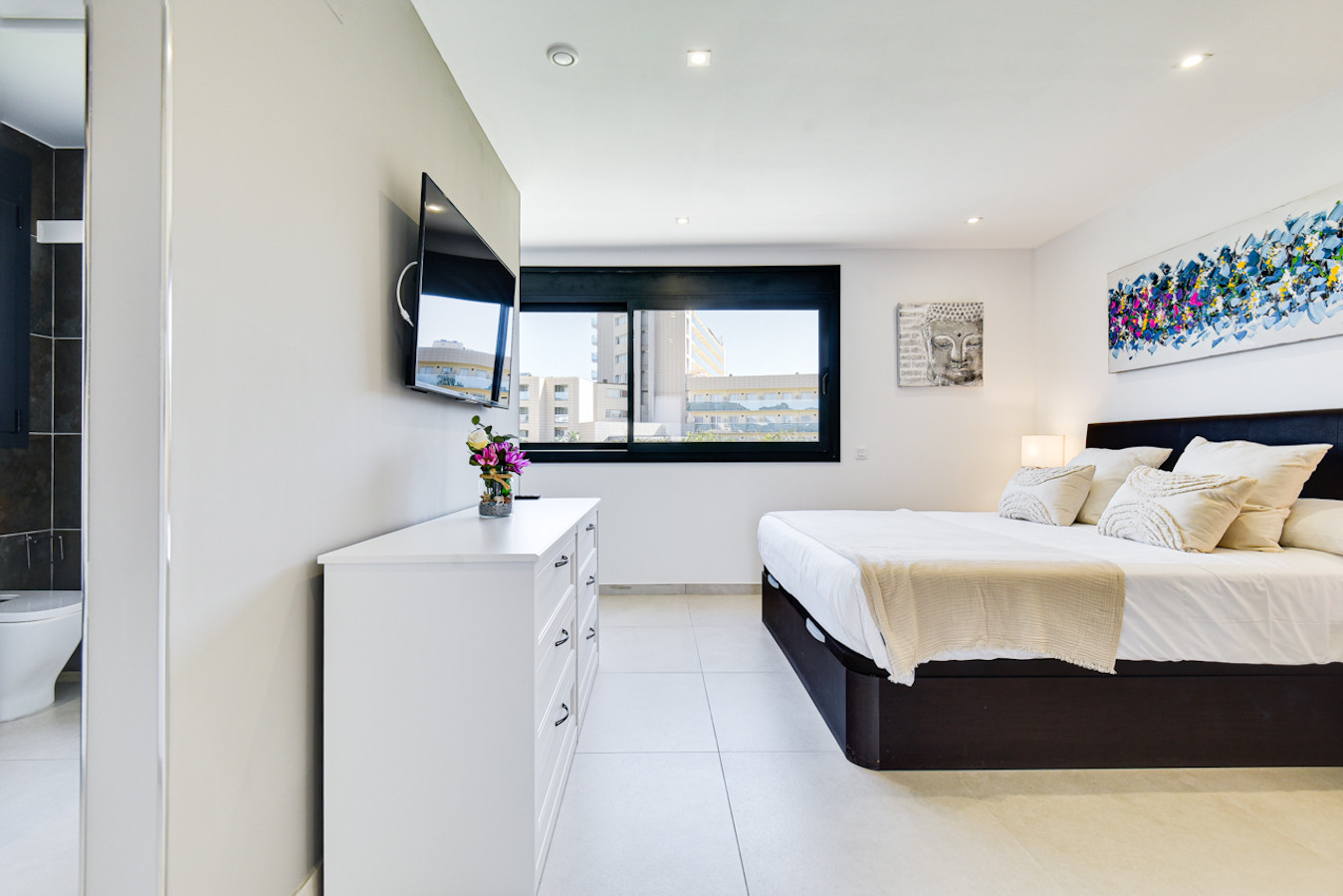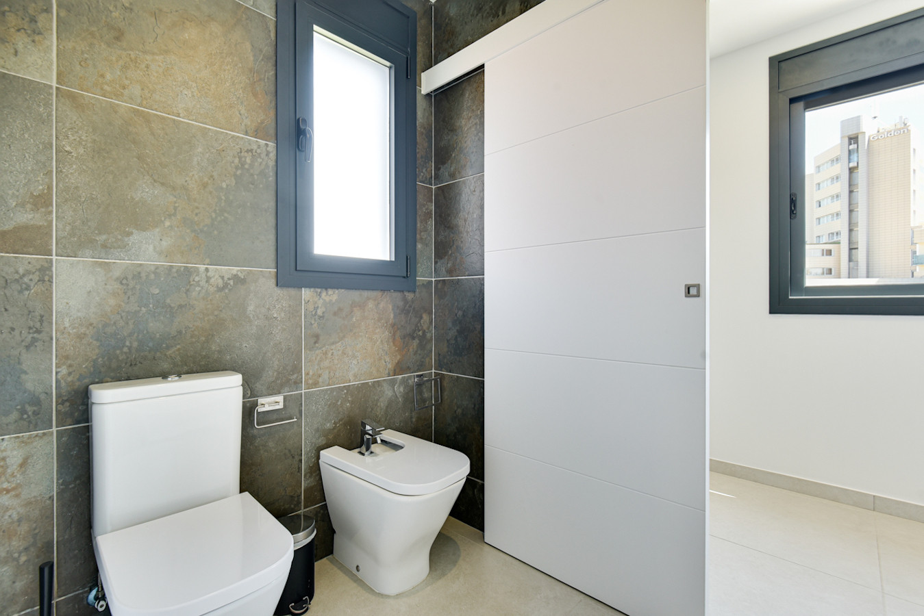On the ground floor you will find a bright living room with a large sofa and dining area, equipped with TV and a Netflix account included. The open-plan kitchen is fully equipped and features an American-style fridge, with direct access to the terrace and pool area. This floor also includes a full bathroom with shower and a separate laundry room with washing machine and dryer.